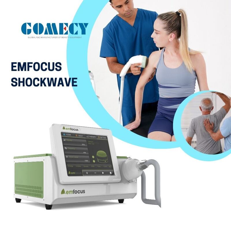 The GOMECY EMFOCUS machine is an "electromagnetic focused shockwave therapy machine," belonging to the category of Focused Shockwave (ESWT) devices. It is used in physical therapy, rehabilitation, sports medicine, orthopedic pain relief, and even some urological applications (such as erectile dysfunction).